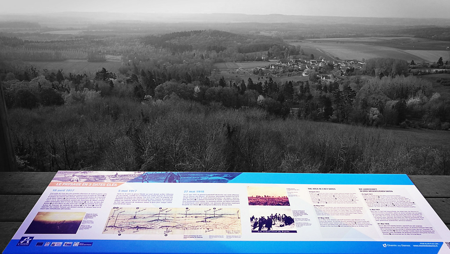 Afin de valoriser et de faire comprendre aux visiteurs l’importance historique et stratégique de ce site de la Grande Guerre, nous avons conçu un parcours d’interprétation mettant en valeur le Chemin des Dames et tous les points d’intérêts symboliques de ce lieu (Tour d’observation, village de Craonne, Caverne du Dragon… L’utilisation de matériaux résistants et symboliques (acier corten, totem, vitres pour l’immersion) a été privilégiée.