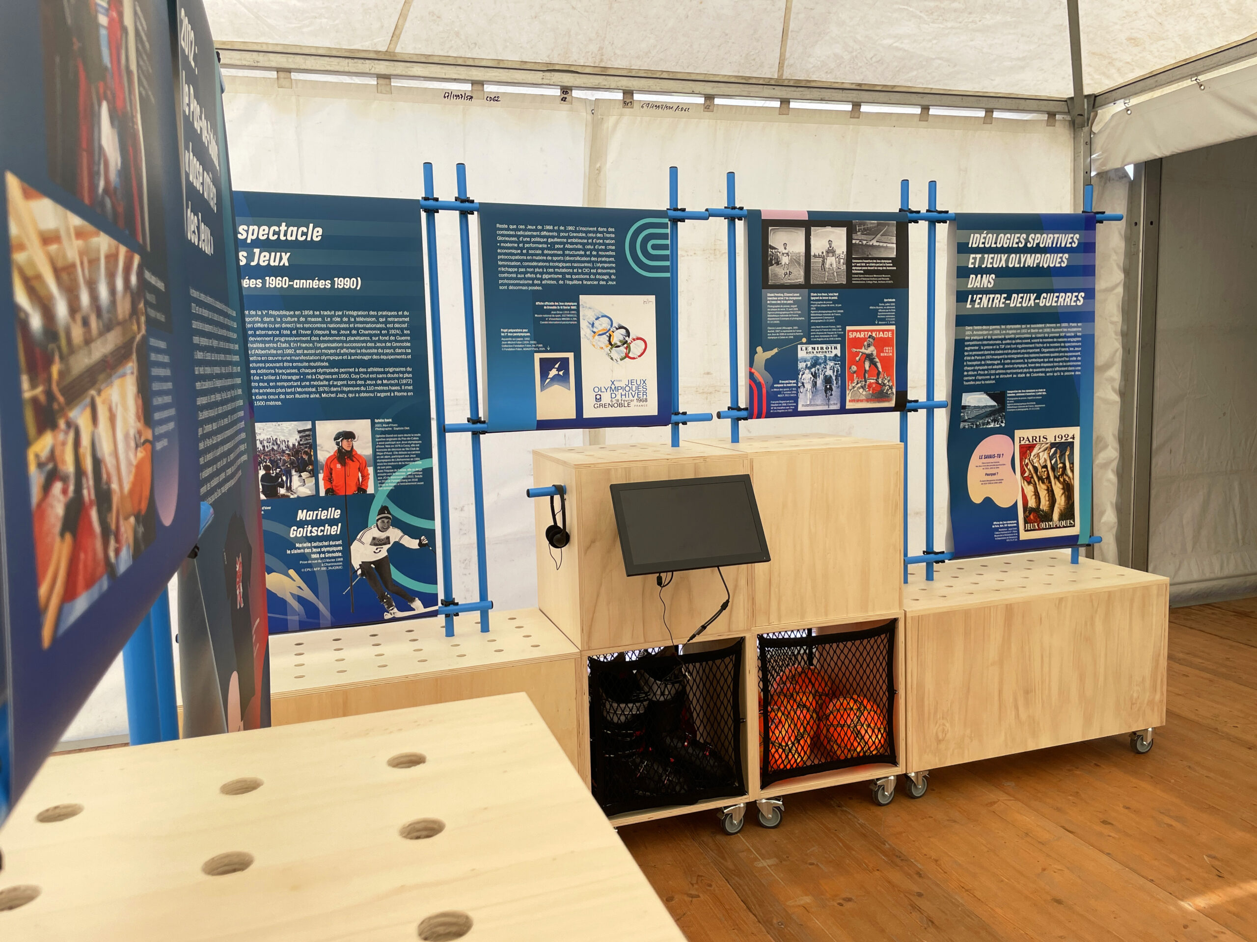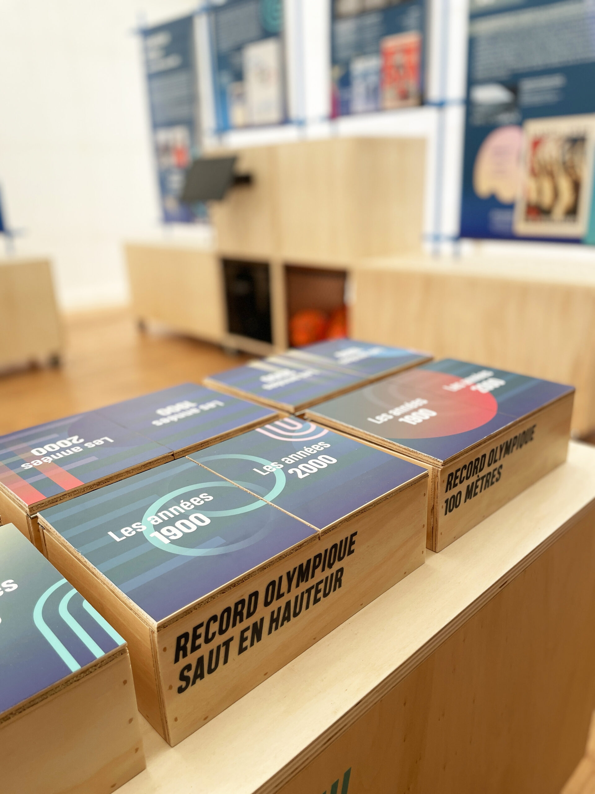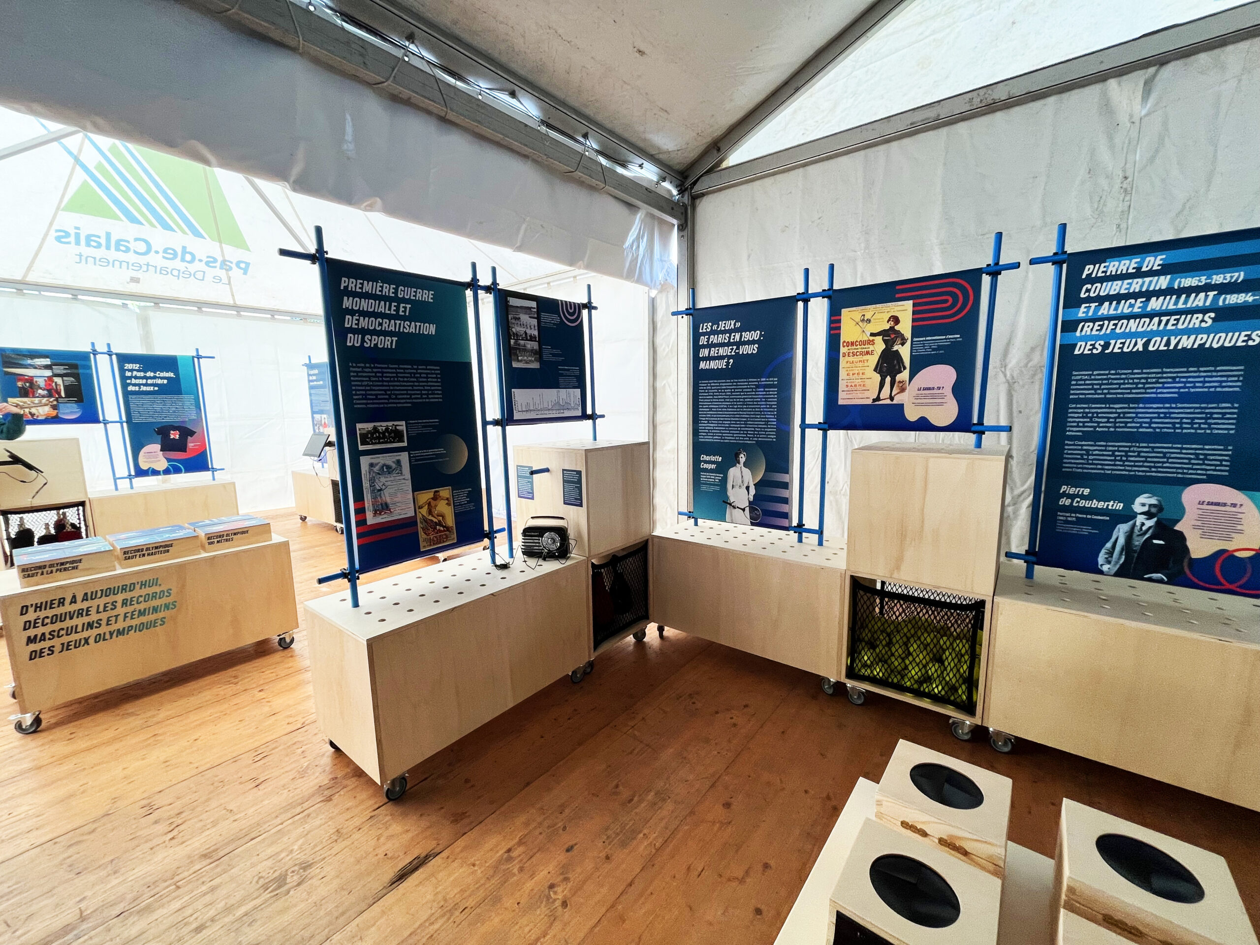Pensée pour être itinérante, l’exposition a été conçue pour être légère, maniable et facile à installer. La scénographie réutilise du matériel sportif — filets, jalons, ballons — associé à des modules en bois simples à monter et démonter, dans une démarche résolument éco-conçue.